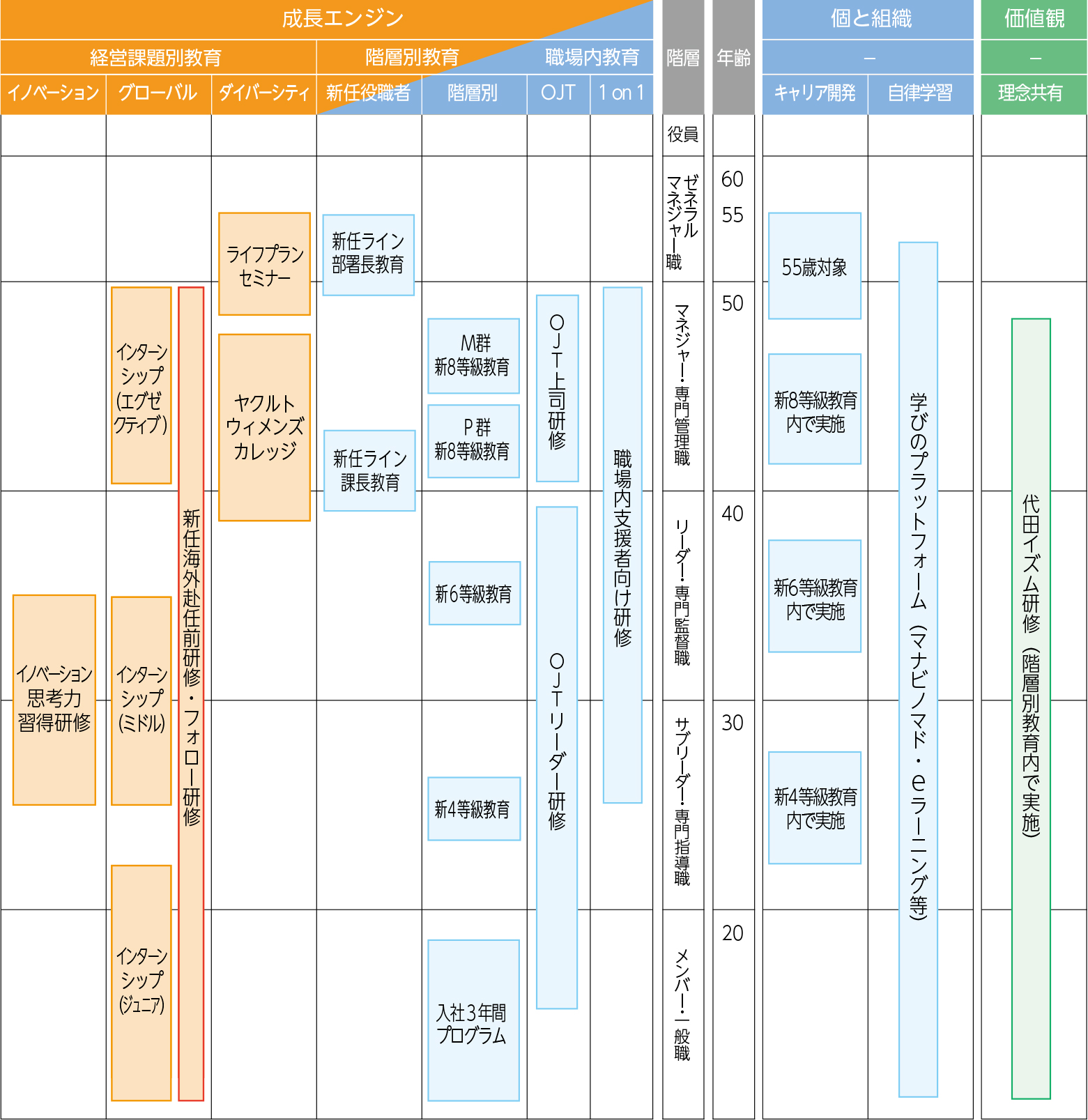 人的資本の重点課題「事業戦略と連動した成長エンジンの確立」「個の成長と組織力の向上」「価値観のさらなる体現」に対応するプログラム体系を構築しています。