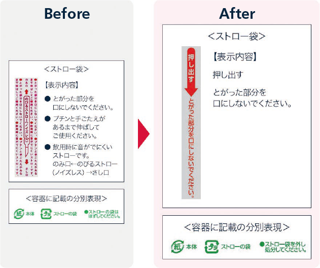 Additionally, because we saw many cases where the bag is detached before the straw is removed, we changed the text on the main package to ”Remove straw bag for disposal,” making it clearer that this text is meant to encourage proper waste separation of straw bags.