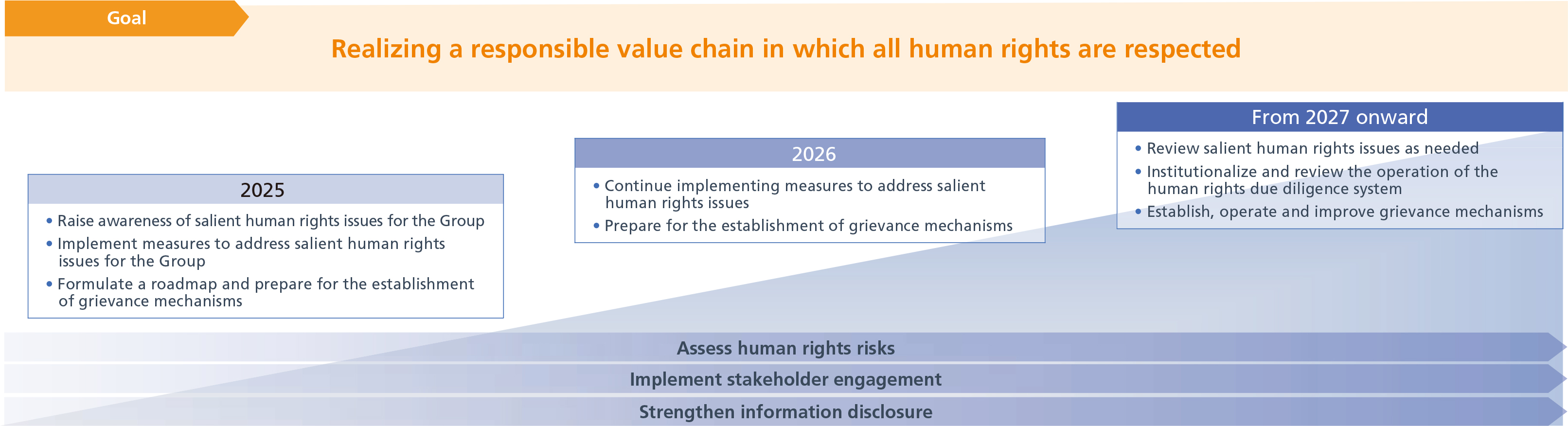 The cross-organizational Human Rights Due Diligence Promotion Council formulates medium- to long-term roadmaps and yearly action plans in its pursuit of promoting concrete measures that enhance respect for human rights. The body is also responsible for implementing the corresponding initiatives, monitoring progress, and formulating plans for the following fiscal year.