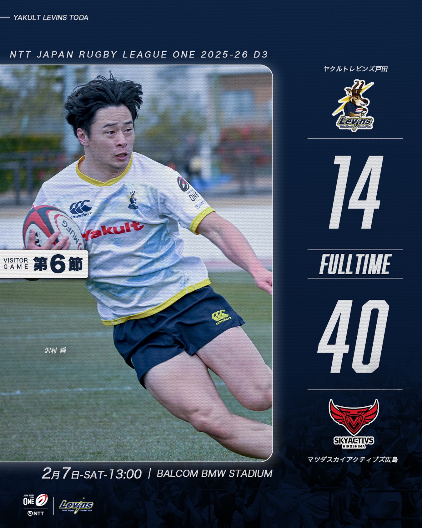 「ジャパンラグビー リーグワン2025-26 ディビジョン3」第6節のマツダスカイアクティブス広島戦はで14-40で敗戦となりました。