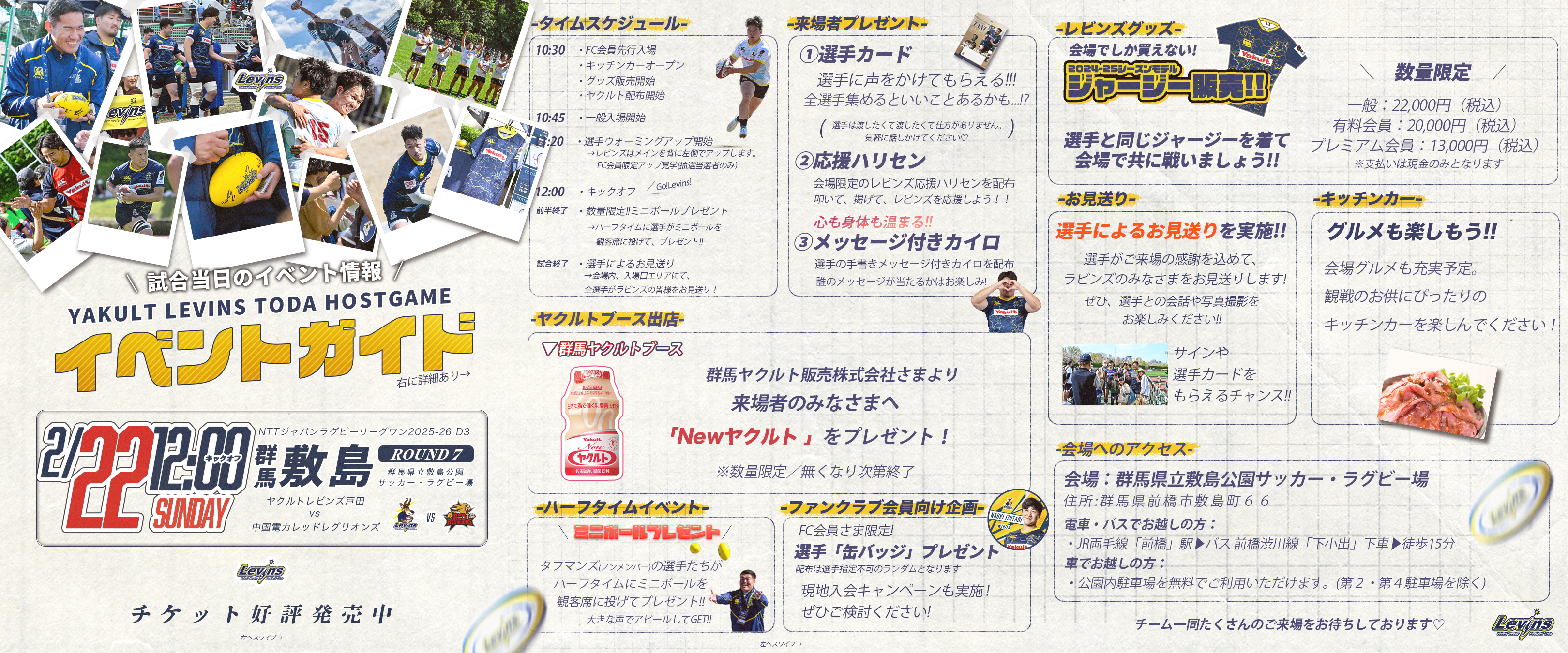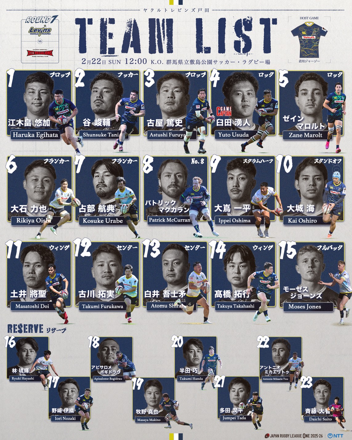 今週2月22日(日)は群馬県・アースケア敷島サッカー・ラグビー場で開催される中国電力レッドレグリオンズとの第7節です!この試合に出場するメンバーおよびイベント情報をお知らせいたします。